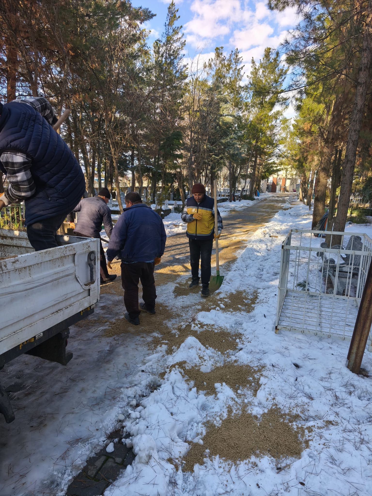 Mezarlık ziyaretleri ile defin işlemleri sırasında vatandaşların kayıp düşmemesi amacıyla mezarlık içindeki yol ve kaldırımlara kum ve tuzlama çalışması yapılıyor.