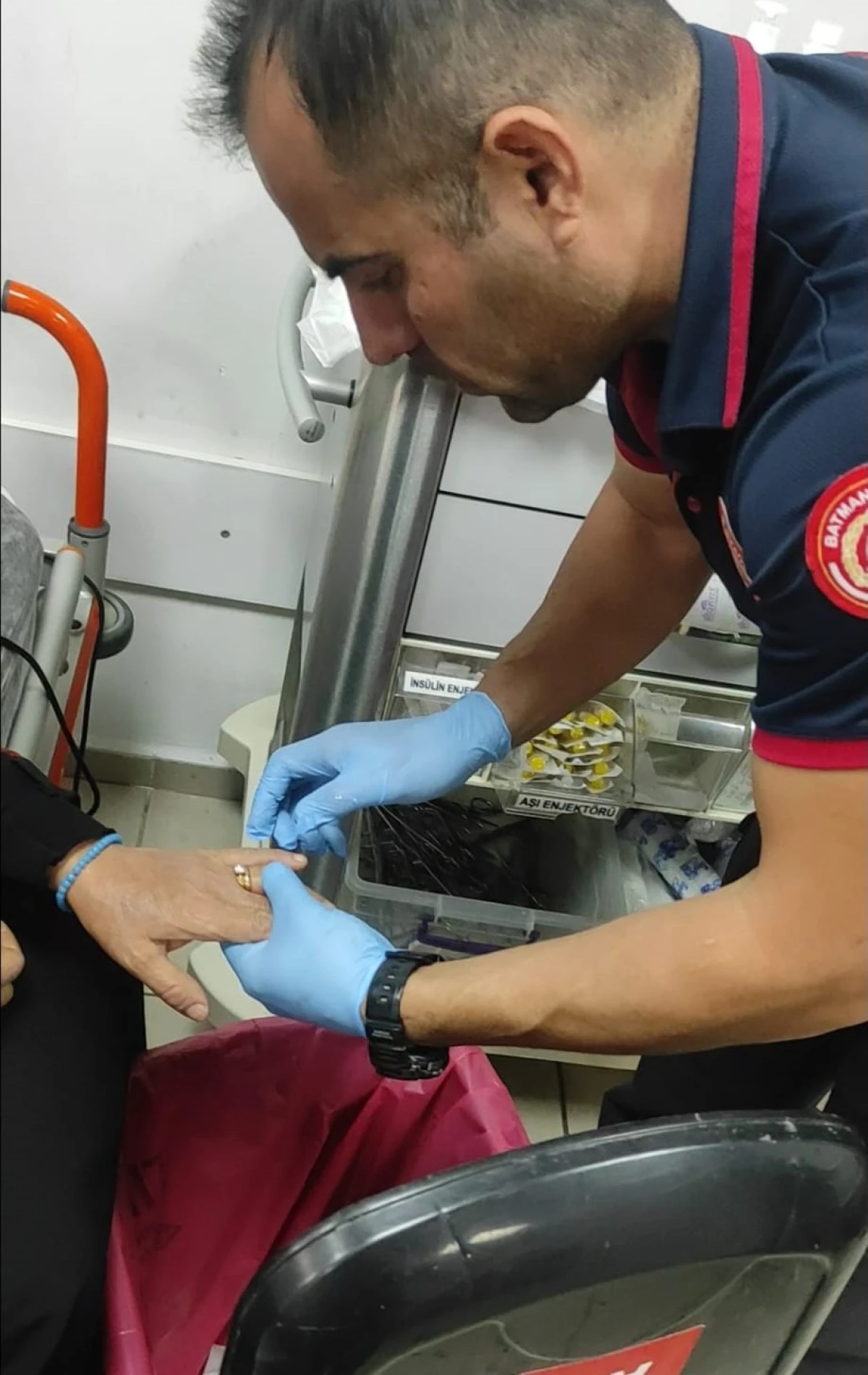 Batman Eğitim ve Araştırma Hastanesi'nde, parmağına sıkışan yüzüğü çıkarılamayan 52 yaşındaki Aslıhan Orak'a itfaiye ve sağlık ekipleri birlikte müdahale etti. Başarılı operasyonla yüzük, mini spiral kesici makine kullanılarak güvenli bir şekilde çıkarıldı.