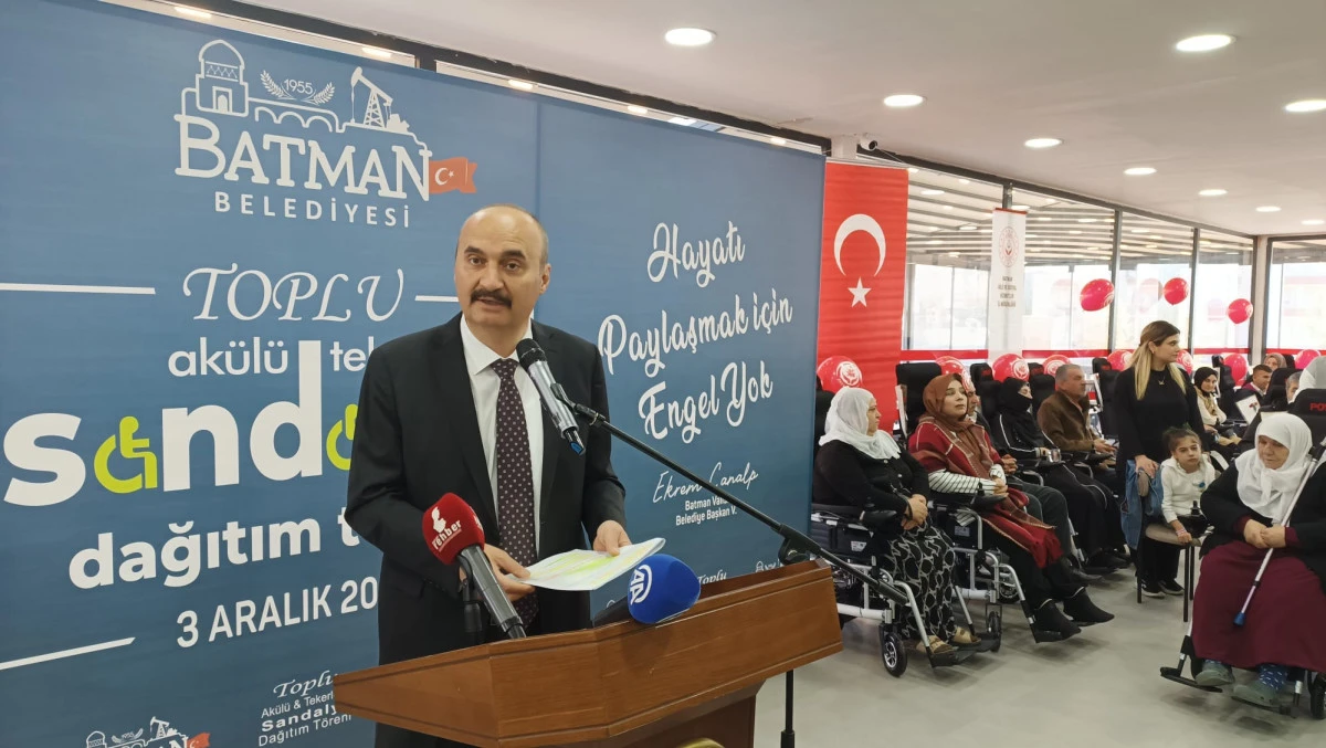 Batman Engelsiz Aktif Yaşam Merkezi’nde düzenlenen programa, Batman Valisi ve Belediye Başkan Vekili Ekrem Canalp katıldı. Dağıtım kapsamında, başvurular sonrası yapılan incelemelerle belirlenen ihtiyaç sahibi 55 engelli vatandaşa 40 akülü ve 15 manuel tekerlekli sandalye teslim edildi. Sandalyelerin toplam maliyetinin 2 milyon 377 bin TL olduğu belirtildi.
