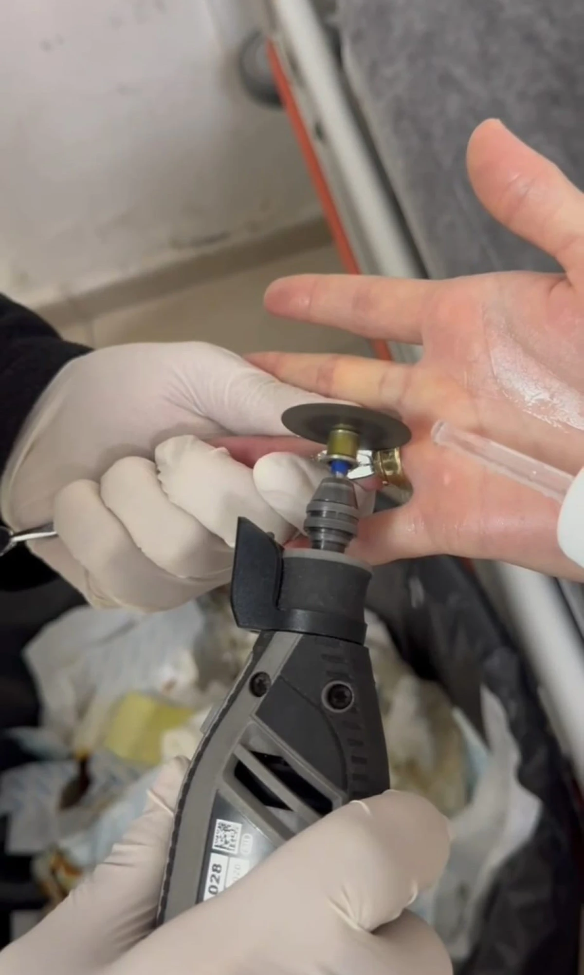 Hastaneye kısa sürede ulaşan itfaiye erleri, doktorların gözetiminde özel bir operasyon başlattı. Parmağa zarar vermemek için büyük bir hassasiyetle çalışan ekip, küçük kesici spiral makine kullanarak parmağına sıkışan yüzükler güvenli bir şekilde kesilerek çıkartıldı.