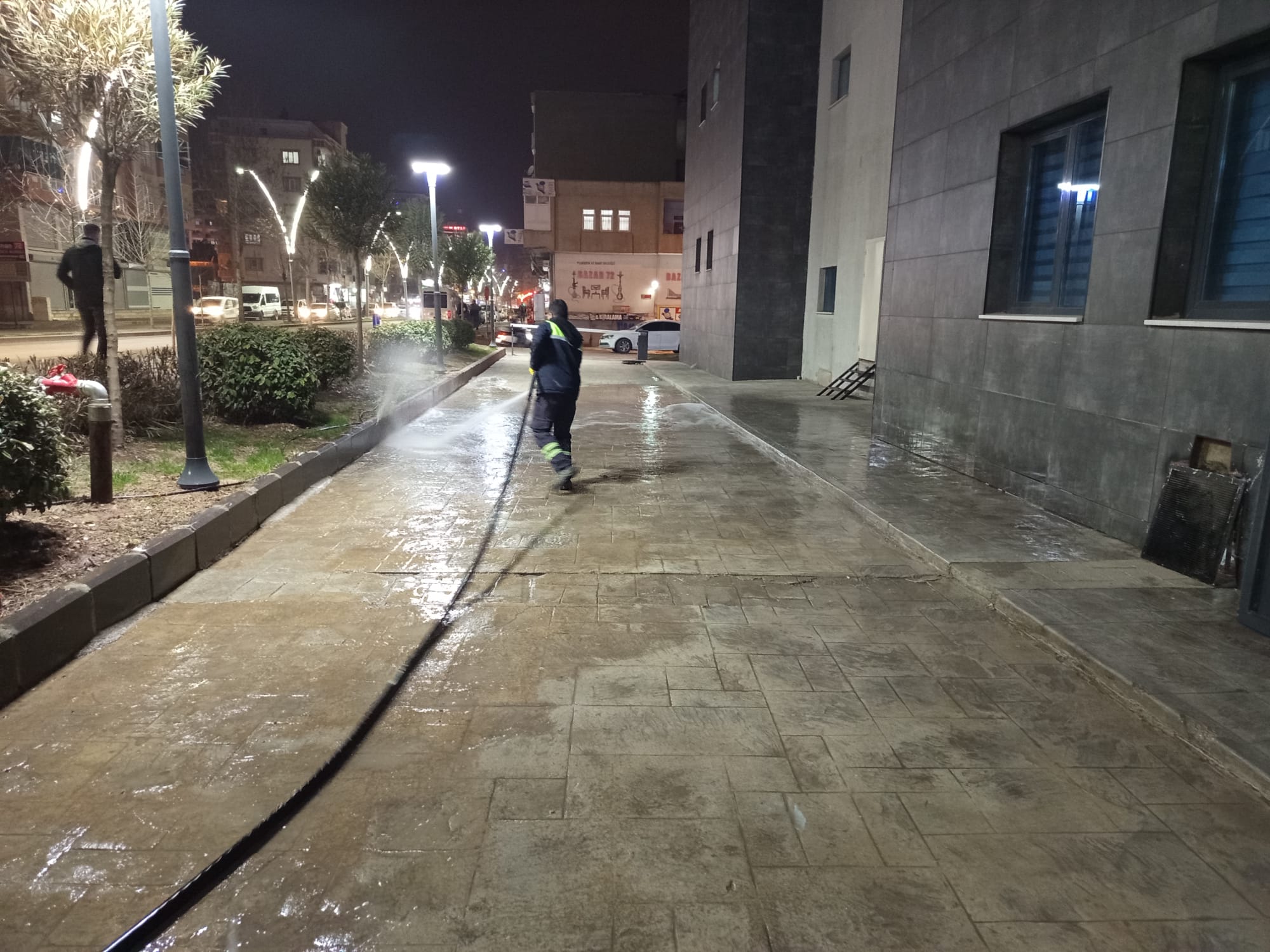 Gece mesaisinde gerçekleştirilen çalışmalara: 1 arazöz, 3 yıkama personeli eşlik etti.