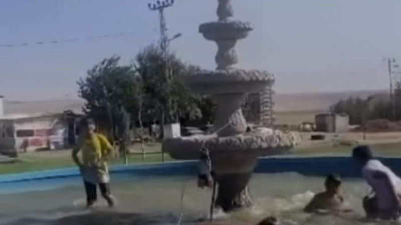 Hava sıcaklığının 46 dereceye ulaştığı Batman'da sıcaktan bunalan çocuklar, süs havuzunda serinlemeye çalıştı.