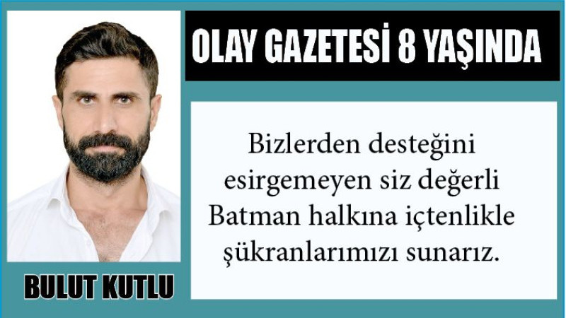 Batman Olay Gazetesi olarak 8. yayın yılına siz değerli okurlarımız ile birlikte ‘merhaba’ demenin haklı gururunu yaşamaktayız. 5 Haziran 2017 yılında yayın hayatına başlayıp ve o günden bugüne birçok önemli habere imza attık. Yaptığımız cesur haberlerle kısa sürede Batman gündemine oturarak vaz geçilmez bir haber ağı olmayı başardık. Her zaman kendi alanında ilklere imza atmayı prensip eden gazetemiz 2023 yılında çağa uyarak yeni bir vizyonla dijital mecralarda da boy göstermeyi başardık. Bizlerden desteğini esirgemeyen siz değerli Batman halkına içtenlikle şükranlarımızı sunarız.